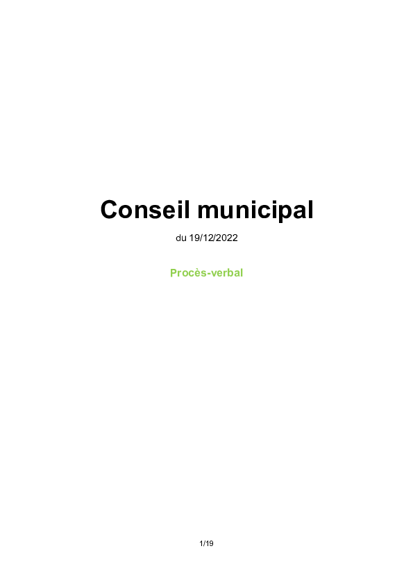 Procès-verbalProcès-verbal du conseil municipal du 19 décembre 2022 Télécharger PDF - 759,9 Ko1 documentPublié le 30 mars 2023