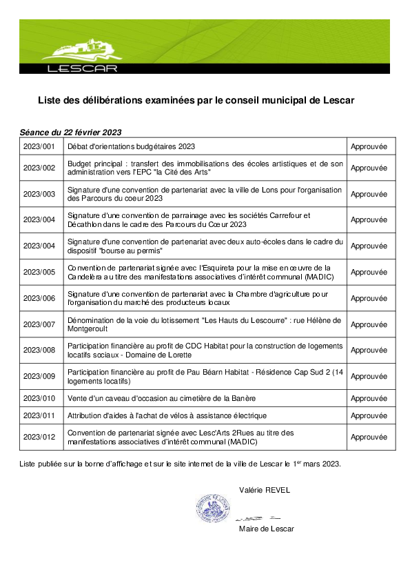 Tableau récapitulatif des délibérations du Conseil municipal du 22 février 2023 Télécharger PDF - 79,7 Ko1 documentPublié le 02 mars 2023